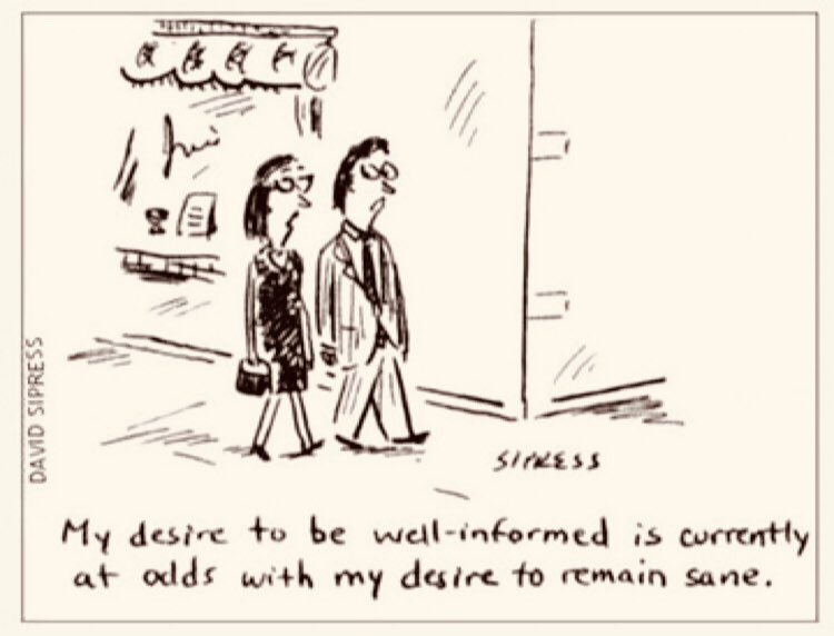 There’s a meme I’m sure you’ve seen, a New Yorker cartoon where one person says to another, “My desire to be well-informed is currently at odds with my desire to remain sane.” We might be tempted to subscribe to the solution offered by Rabbi Bob Alper who quipped when he moved his family to Vermont, “We’re too remote for cable so we have a satellite dish. We can pick up some pretty obscure stations, including a Jewish Cable Channel. Every hour a guy meanders on the screen and says, ‘You don’t wanna know.’”